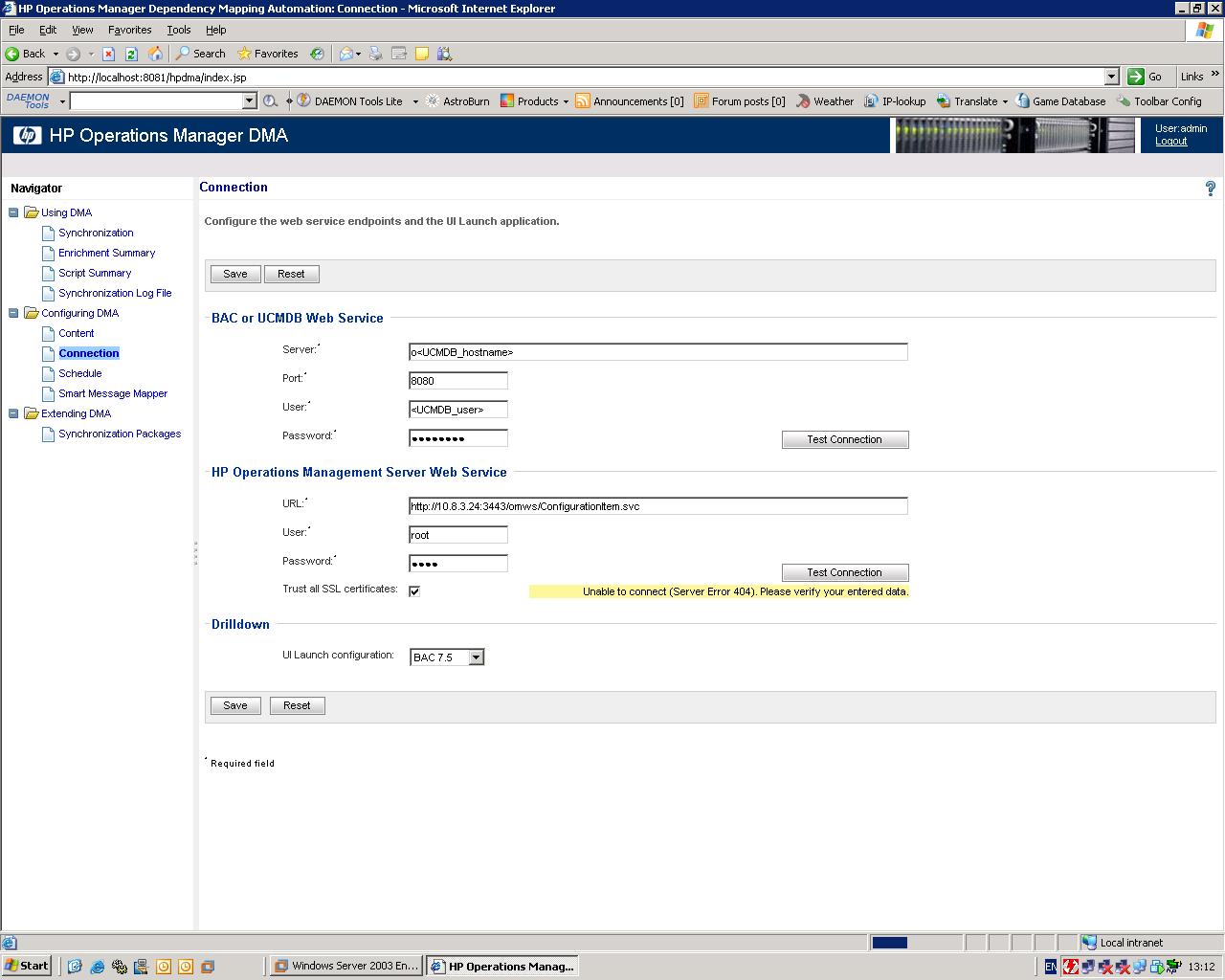 ошибка Unable to connect (Server Error 404). Please verify your entered data.